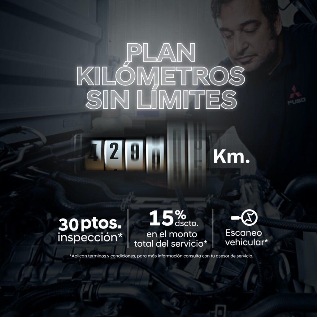Autoniza Perú S.A.C.: Autoniza FUSO | Campaña Postventa: Plan Kilómetros sin límites: Gratis 30 puntos de inspección , 15% de descuento en el monto total del servicio, escaneo vehicular | Febrero y marzo 2025 Imagen referencial. Campaña válida en Autoniza Peru S.A.C. (Autoniza FUSO) del 07/02/2025 al 31/03/2025 y/o hasta agotar stock (03 inspecciones por día). Promoción válida únicamente para unidades Fuso, los cuales se encuentren fuera del período de garantía, según lo establecido en el Manual de Servicio de la marca.